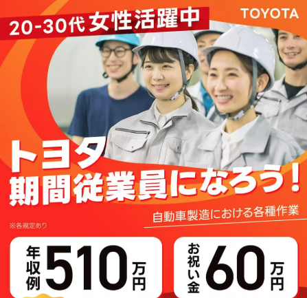 「稼げる」だけじゃなく「貯まる」条件が揃ってるから、迷ったらトヨタを選べば間違いなし。 1年目から年収例510万円を狙えて、さらに祝い金60万円+慰労金・報奨金306万円以上。寮費・水道・光熱費が無料で、生活コストを落として手取り感アップ。未経験スタートも研修で安心。将来は正社員登用で年収1000万円も狙える。